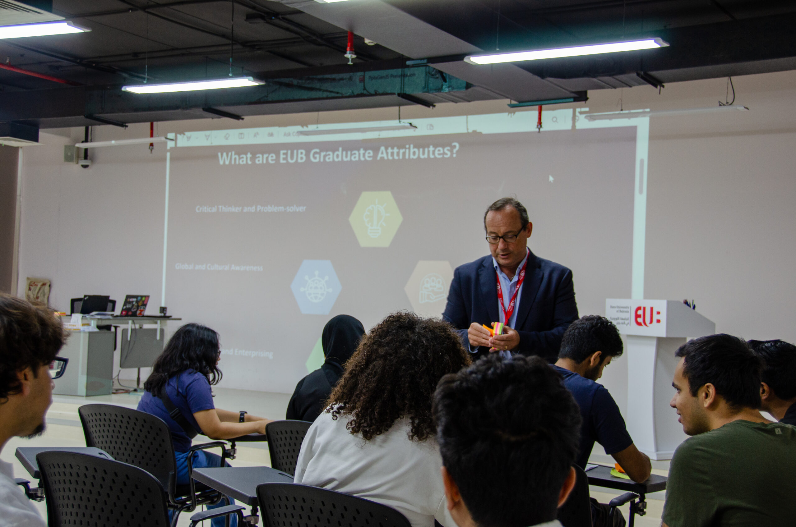Graduate Attributes: Exploring how our students shape their futures through skills, values, and reflection In this post, I wanted to share and reflect on a recent session with our new students focused on our Graduate Attributes. The students worked in small groups to discuss and consider the skills, values, and characteristics that underpin our five EUB Graduate Attributes. With plenty of post-it notes and a lively discussion, the session aimed to give students the opportunity to think about what our graduate attributes can mean to them personally, and how they can take ownership of them during their time at university What are EUB Graduate Attributes? Graduate attributes represent the essential skills, knowledge, and qualities that universities seek to cultivate so students can thrive both during and beyond their studies. At EUB we talk about five graduate attributes that we believe shape not only academic success, but also the kind of people and professionals our students become: Together, these attributes provide a framework for the kind of graduates we aspire to nurture: adaptable, innovative, and socially conscious leaders. Why do graduate attributes matter? Graduate attributes are more than abstract ideals. Research and sector trends consistently highlight that employers and communities value not only subject expertise, but also critical thinking, digital literacy, cultural awareness, and social responsibility. For our students, these attributes open pathways to professional success and empower them to make meaningful contributions to society. By working actively with the attributes during their studies students begin to see how their academic and extracurricular experiences interconnect, shaping both who they are now and who they are becoming. How can we bring attributes to life in practice? Our recent session provided a clear example. In small groups, students explored each attribute, noting the skills, behaviours, and values they believed were most relevant. Post-it notes clustered around each attribute raised awareness and attention as well as capturing a range of insights: • Problem-solving means not just finding answers, but asking better questions. • Social responsibility is about small everyday choices as well as big community projects. • Being globally aware includes listening to peers from other cultures right here at EUB. This collaborative, interactive format encouraged students to define attributes in their own words and recognise them in their everyday academic and personal lives. As lecturers, we can build on this approach by embedding graduate attributes into our curriculum, our seminar sessions, assessment activities, and feedback conversations — helping students continually connect their active engagement in different sessions with the wider global community they participate in. Graduate Attributes and the Falcon Award At EUB, we are taking the opportunity to encourage students to explicitly engage with our Graduate Attributes. The Graduate Attributes have been embedded into our Falcon Graduate Attribute Award. This award will recognise students who demonstrate high engagement with the attributes through self-awareness and reflection. Working towards the award involves: Students who complete the process receive a certificate and LinkedIn badge, formal recognition that enhances their employability and professional profile. More importantly, they gain confidence in articulating the value of their EUB education, both to themselves and to future employers. The role of the Teaching and Learning Centre The Teaching and Learning Centre collaborates with staff across EUB to embed graduate attributes meaningfully into teaching, learning, and assessment. We provide training, guidance, and opportunities to innovate in curriculum design, helping colleagues align their modules with the attribute framework. During the academic year, we will also run seminar sessions where staff can share practice, and students can showcase how they are developing the attributes through their studies and extracurricular activities. Together, these conversations ensure that graduate attributes remain a living, dynamic part of our ethos, not just a list of words. Graduate Attributes embedded in EUB teaching practice The session with the students reminded me that when students are invited to actively engage with our graduate attributes, they bring fresh perspectives and a strong sense of ownership. As staff, we have the opportunity to harness that energy, embedding attributes across all aspects of the student journey. I hope this reflection sparks conversations in your teaching teams. If you would like to explore further how graduate attributes can be integrated into your modules or how your students can participate in the Falcon Graduate Attribute Award please connect with us at the Teaching and Learning Centre. Together, we can ensure that our graduates leave EUB with not only academic excellence but also the confidence, skills, and values to shape a better future.